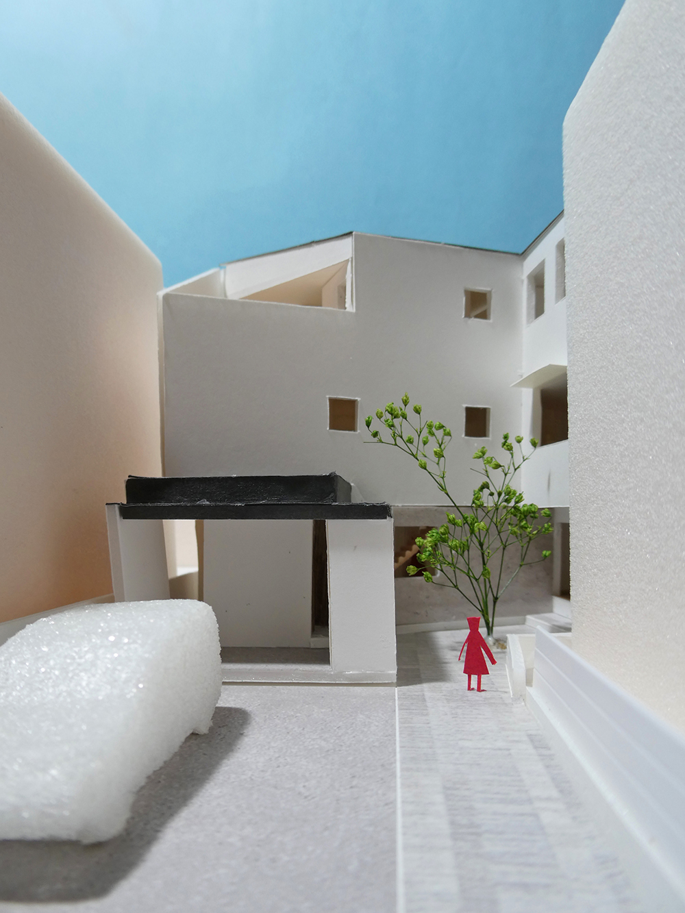 この住まいは、変形敷地の特性を活かし、コの字型に建物を配置することで中庭を暮らしの中心に据えています。周囲の視線から守られたプライベートな庭にはシンボルツリーを植え、四季の移ろいを日常に取り込む豊かな空間としました。道路側にはゲートと2台分のカーポートを設け、中庭へと続くアプローチが住まいへと誘います。内部は、それぞれの個室の充実に加え、リビングの周りに多彩な居場所を計画しました。学習や在宅ワークに使えるスタディコーナー、趣味に没頭できるヌック、ソファで寛ぎながら外の広がりを楽しめるスペースなど、家族一人ひとりが心地よく過ごせるよう工夫されています。キッチンからはリビングや家族の様子を見渡すことができ、自然とつながりを感じられる構成です。さらに、これまでの生活で感じた動線や間取りの課題を解消するとともに、将来の変化にも柔軟に対応できる計画としました。適材適所に収納を設けて日常の動きをスムーズにし、3階の個室スペースは将来的に二世帯での暮らしにも対応できるよう配慮しています。