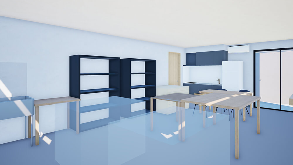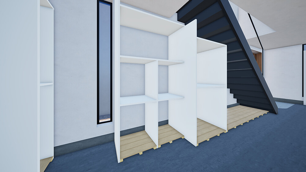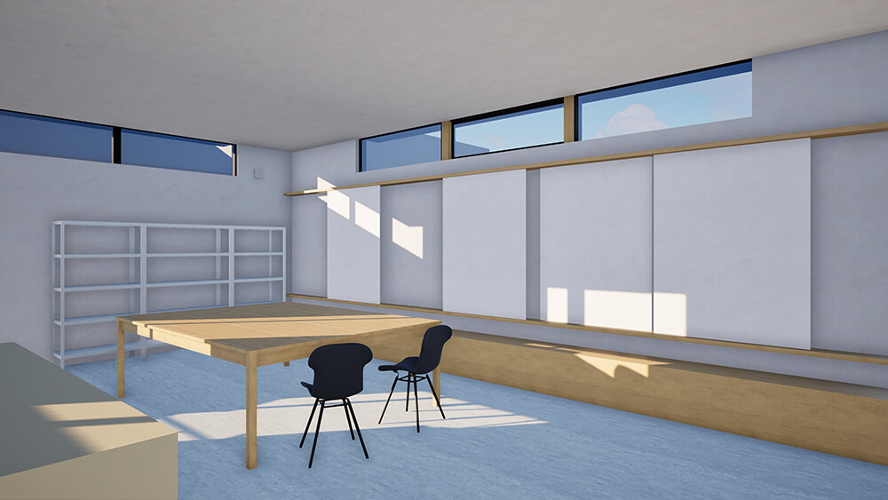 1階には玄関・倉庫・アトリエBを配置し、階段上部の窓から入る柔らかな明かりが空間を明るく保ちます。倉庫には造作棚や階段下の収納を設け、制作道具を整理しやすい環境を整えています。アトリエBは高窓から採光を確保し、作業台やラックを壁面に沿って配置することで、シンプルで使いやすい作業空間としました。