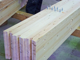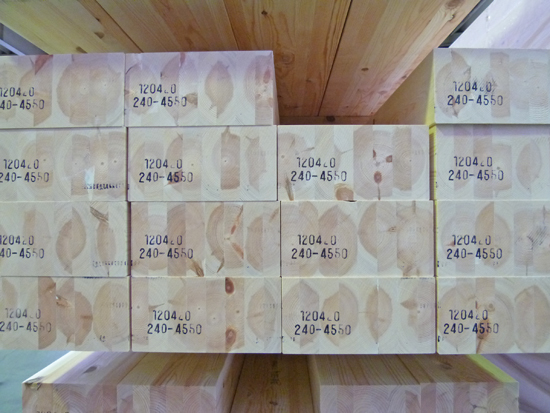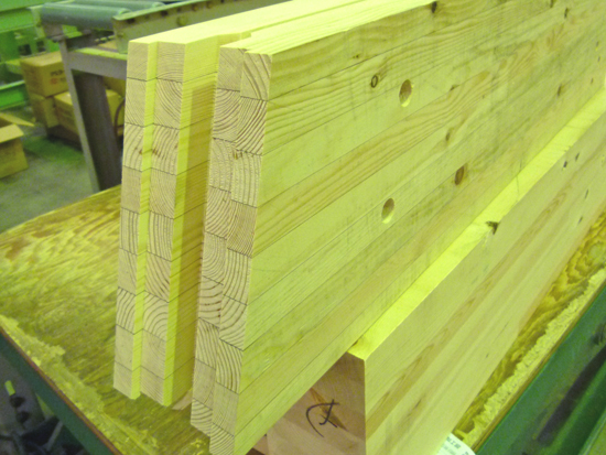 集成材メーカーから材料(集成材の束)が運ばれてきて、加工が始まります。