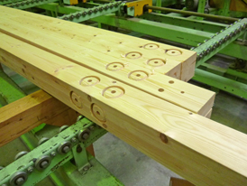 木材(主に海外)⇒ 集成材をつくる(国内) ⇒ プレカット工場で柱や梁に加工(国内7工場) ⇒ 工事現場へ