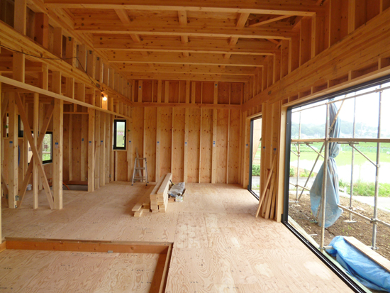 いつもと違う方向(西側)から見てみました。屋根は太陽光発電パネルを載せた時の発電効率が良くなるように、南側に傾斜させています。