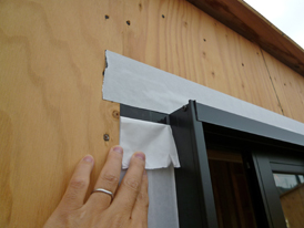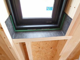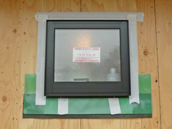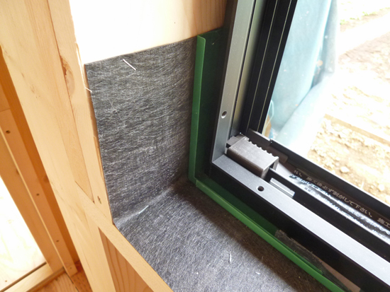 この住宅は比較的ローコストですが、施工会社[(有)リモルデザイン]の標準仕様で、先張り防水シートは2重に施工され、かつ、上側のシート(緑色)には水返しがついています。ここまでしておけば窓周りの防水としては将来にわたり完璧ではないでしょうか。