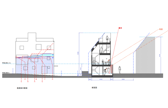 早速、重要なテーマである室内への光の入り方を具体的に検証するため、一年の内で太陽高度が一番低くなる(影が長くなる)冬至日の日影図を書いてみました。日影図とは、建物の影ができる範囲や時間ごとの影の動きをみる図面で、土地や建物の日当たりを確認することができます。オレンジの線が8時から16時までの南側建物の1時間ごとの影の動きを表わし、水色が2時間、青色が3時間日陰になる範囲を現わしています。(冬至日、地盤面、8〜16時) この日影図では、影の落ちる位置(高さ)は地盤面としていますが、建築法規では1階の窓の高さを想定した地盤面+1.5m、2階の窓の高さを想定した地盤面+4.0mの高さでの検討が求められます。