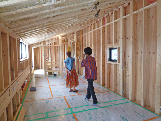 2階には前回の打ち合せで決まったナラの無垢フローリングが張られ、床は養生されています。傾斜天井の低い方の高さは1.95mですが、想像していた以上に広々感じます。