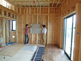 LDKには床暖房(電導性カーボンフィルム・プリマヴェーラ:アルシステム)が敷かれ、今日からフローリング(ウォールナットクリアオイル:IOC)が張られはじめました。