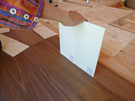 フローリングの色と合わせながら、キッチンの面材(メラミン化粧板)の色を決定。壁掛けテレビの取付け高さも、型紙を使っていっしょに決めました。