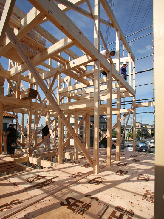 東京ビッグサイトでの「SEA’Sまちかど建築家展」(2012.5)で初めてお会いし、設計〜工事と進めてきた『カフェのある家(朝霞市)』(SE構法3階建)は、昨日無事上棟。建て主の方、工事関係者の方々と共に建物の無事を祈り上棟を祝いました。