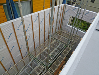 外壁の下地となる通気胴縁の施工がほぼ終わっています。左はサイディング仕上げとなるデッキテラス部分で、通気胴縁はタテ向きに入っています。右はガルバリウム鋼板たてハゼ葺き仕上となる道路側面です。胴縁はヨコ向きに入れるため、空気がタテに流れるように、細かな孔が開いた通気胴縁を使っています。