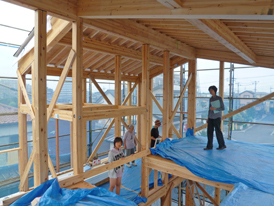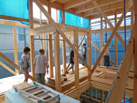 元大工のお祖父様は柱の通りを確認されて、SE構法の建て方精度の良さに驚かれていました。