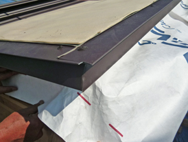 屋根の軒先やケラバは、「通気」と「防水」という相反する要求をクリアするための重要な部分なので、施工状態をしっかりチェックします。屋根表面のアイボリー色のシートは雨音を和らげる吸音シートです。