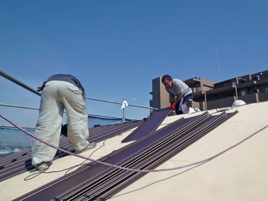 屋根はガルバリウム鋼板の竪ハゼ葺き。色は建て主の方と一緒に決めたチョコレート色です。風が少しあったようですが、この時期の屋根工事は過酷です!