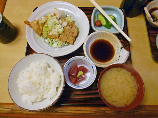 魚貞(うおさだ)は魚の美味しいお店なのですが、一番よく頼むのは「豚天定食」。豚ロースを天ぷらの衣で揚げ、ポン酢に大根おろしを入れていただきます。シジミのお味噌汁とお刺身も付いていてお勧めです!