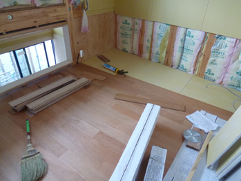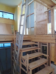 地下と2階には複合フローリング(チェリー)が施行中です。木で作る部分の階段も骨組みができて、いままでハシゴを使っていた上下の移動が楽になりました。