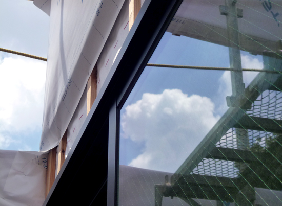 夏らしい雲の浮かんだ空が、窓ガラスに写り込みキレイでした。庇をつけにくい窓には、日射侵入率(日射熱取得率)0.41程度のLow-Eペアガラス(遮熱タイプ)を使って遮熱性能を上げ、フラット35Sの開口部の省エネルギー性基準をクリアしています。
