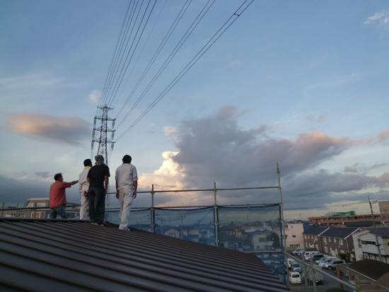 テレビ電波の方向を確認するため、東京スカイツリーが見えるかどうか屋根に登っている建て主の方と工事の方々。