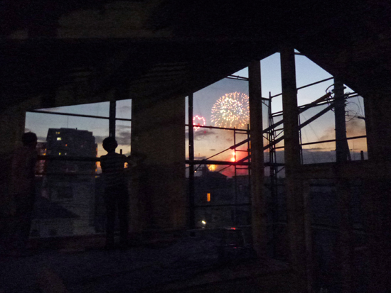 『カフェのある家(朝霞市)』の3階には、花火を見るためのバルコニーがあります。この日はちょうど朝霞市の花火大会で、夕方一緒に上がってみました。想像以上によく見えて、建て主のご家族の方も大満足!さらに、同じ日に開催されていた板橋・戸田の花火も窓から見えることがわかり、新たな楽しみが加わりました。一番右が板橋・戸田の花火です。