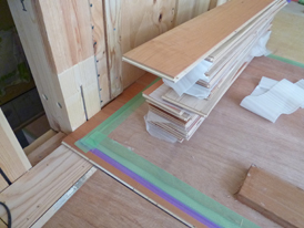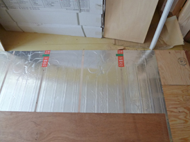 LDKには床暖房パネル(ヒートポンプ温水式)が敷かれ、フローリング(幅広チェリー厚突合板)が貼られはじめました。