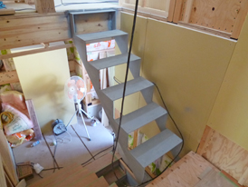鉄骨部分の階段(下地)がつき、木製幅木も施工されています。