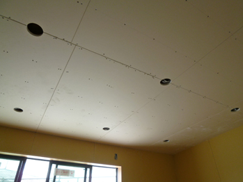 天井埋込みになるダウンライト照明の孔開けもはじまり、玄関扉(製作)も取付け完了。