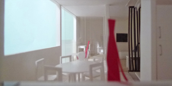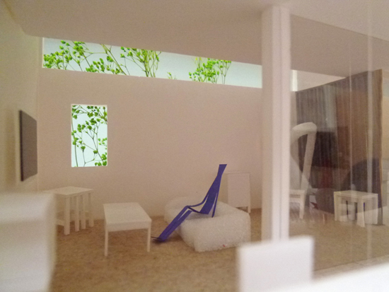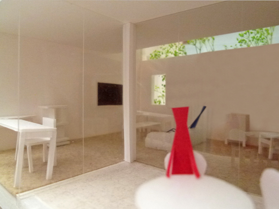 ダイニングキッチンからデッキテラスを通してリビング側を見る >>2012.3.2 『カフェのある家』の1/50模型製作中 生活の楽しさが感じられる模型
