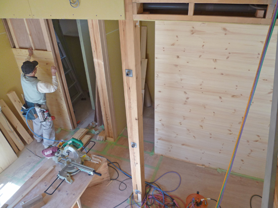 現在、仕上げ工事中のSE構法の木造3階建ての住宅、『カフェのある家(朝霞市)』のリビングダイニングの壁にパインの無垢板が張られました。実(さね)加工されたフローリングと同じ塗装品ですが、丁寧な施工でキレイな板張り壁ができつつあります。
