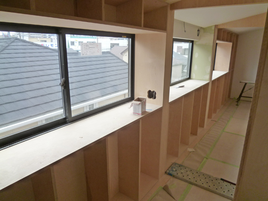 3階では本棚(ロシアンバーチ)が施工されました。可動棚は現在加工中。