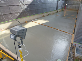 「周囲に溶けこむいい色」「少し和も感じられる貼り方」など建て主の方の感想は上々。ほっ。 駐車スペースの土間コンクリートは養生中。