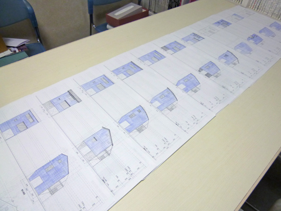 今日は『緑をつかまえる家』の外観をまとめて行くために、屋根の形、軒の有無、主要な窓、北側斜線のかかり方、材料の切り替え位置などを、スケッチを描いて検討しました。