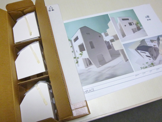 お正月休みに建て主の方に検討してもらおうと、『緑をつかまえる家』の図面とスタディ模型を宅配便で送ることになり、スタッフの須田がダンボールでパッキング。