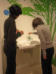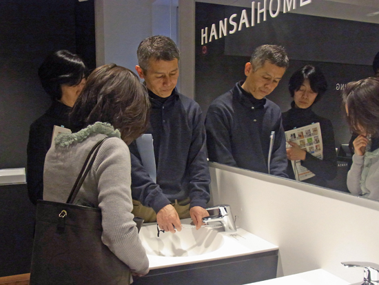 毎日使うことになる水栓は、実際に操作してみて使い易さや水の出方を確認。洗面器と水栓の組み合わせの相性や、水のはね具合なども時間をかけて検討しました。