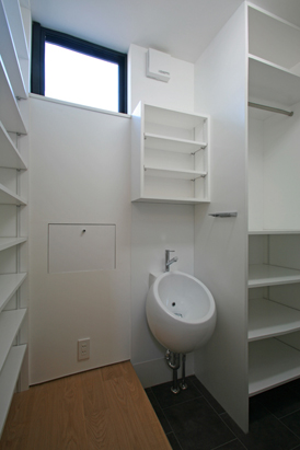 大工さんと建具屋さんで造った洗面化粧台 左は天井いっぱいのリネン収納。