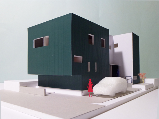 道路側外観。右側の奥側に玄関ポーチが見える。手前の建物が張出した下はバイク・自転車置き場。外壁は緑色(ダークグリーン)のガルバリウムサイディングで仕上げる予定です。