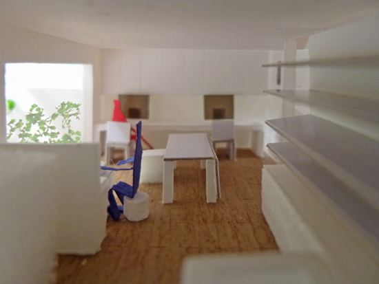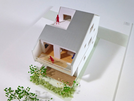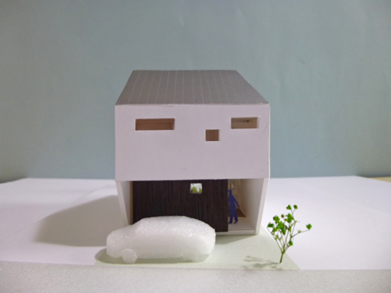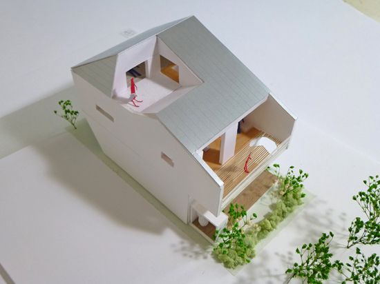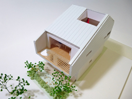 『緑あふれるアトリエのある家』の反転案の模型。平面をただ反転させるだけではなく、敷地の特徴を活かしながら、内部の空間の気持ち良さを考えて、” 形 ”も見直しました。