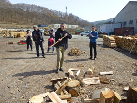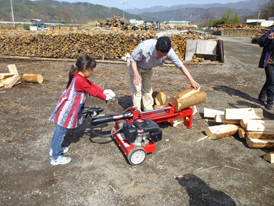 斧による薪割りや、専用の機械による薪割りにも挑戦。