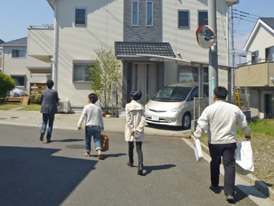 OZONE(オゾン)家づくりサポートのコンペをしたときは、造成地はまだ区画割り中で何も建っていませんでした。今はもう周りの住宅はすべて完成し、この住宅の敷地だけがぽっかり空いた状態です。周りは同じような子育て世代の方が多く、近隣挨拶時にも会話がはずみ、ほのぼのしたアットホームな雰囲気でした。