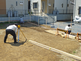 建物の配置を確認。工事の基準となる高さや、基礎の深さ、土留めの位置、基礎部分の配管取り出しの方法なども、工務店(株式会社小山工務店)の方と打合せして帰りました。