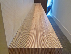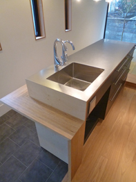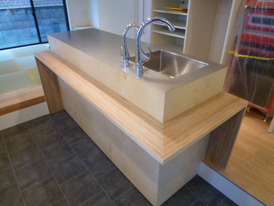 ロシアンバーチ積層合板で造ったキッチンカウンター。土間側のカウンターテーブルは、バウムクーヘンのようなロシアンバーチの積層面を見せています。