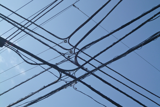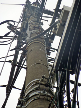 4.電柱(東電所有)は、文字通り電気を送る電線だけでなく、NTTの電話線、CATV会社のケーブル、設置用の支線など、たくさんの「線」を支えている。