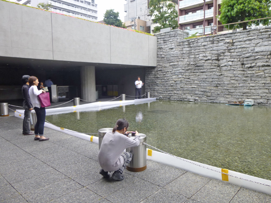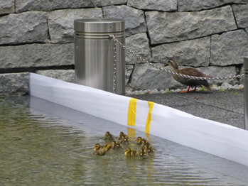 お昼休みには、設計事務所アーキプレイスのみんなやバイトに来ている学生さんと一緒にカルガモの様子を見に行きました。今朝見つけた時の赤ちゃんガモは、親ガモから離れられない様子でしたが、廻りに慣れたのかずーっと元気に動き回っていました。