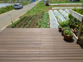 建て主の方がお友達と作られているデッキ廻りも、手すりの囲いが付けば完成です。建物の西側は、薪の乾燥・保管スペースに。中央は、雨水を溜めて再利用するためのタンク。