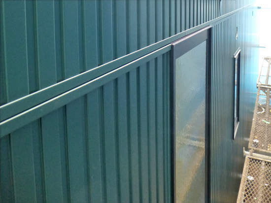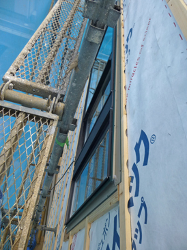 ガルバサイディング同士のコーナー部分は役物を加工して納めます。下地となる胴縁は横方向に通すため、通気用に孔の空いた通気胴縁を使用します。窓周りのガルバの板金も打ち合せ通りにキレイに施工されました。