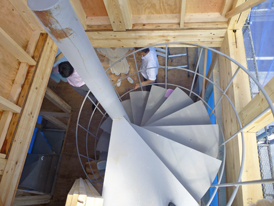 螺旋階段を上がって、屋上からの眺望も確認。周りの状況がわかると、屋上の使い方のイメージがよりリアルに想像できるようでした。建て主の方が少し心配されていた1階の部屋の広さは、想像していたよりも広かったようで少しほっとしました。1階は周りの地面に少し埋まっているので、土台の位置が一般的な木造住宅よりも高くなっています。