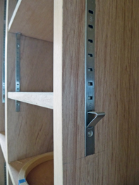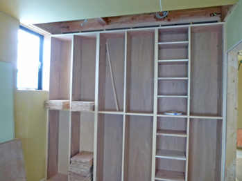 大工さんの造作家具も着々と進み、書斎の床から天井までの本棚もできました。材料はラワンランバーで、可動棚用のステンレスの棚受け柱を両側から埋め込みビスで止めています。
