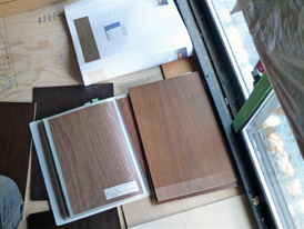 地床に使う樹種も、窓から入る光にかざして、色の具合、照明器具や障子の桟の色との関係を、想像しながらイメージを膨らませました。床の間に使う群青色の和紙との相性で、ローズウッドに決まりました。かなりモダンな和室になりそうで楽しみです。