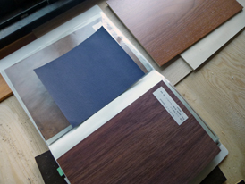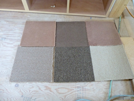 左は洗面室の床に使う、塩ビ床シート。 右は書斎の床に使うカーペット。