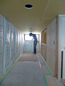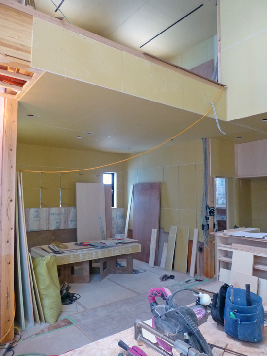 内部では、プラスターボードが大分貼られました。ダウンライトの穴開けが終わったところもあります。(早い!)