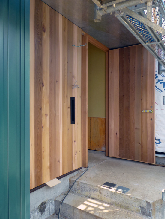 ポーチの壁には玄関扉と同じ杉板(板目)が施行されました。杉板は濃い茶色に塗る予定で、ダークグリーンのガルバサイディングとの関係も良さそうです。