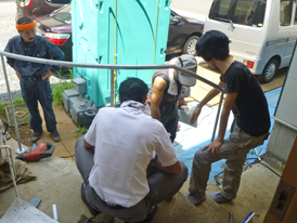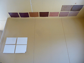 塗装屋さんにあらかじめ作ってもらった塗装見本を現場におき、床のタイルや周りの材料との調和を見ながら、板壁と玄関扉の色を決めていきます。