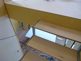 木で作る地下への階段も下地まで完成。踏み面、蹴込みとも絨毯で仕上げます。