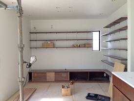 大工さんの造った家具に、建具を取付中の建具屋さん。調整が終わった後、塗装され完成です。テレビなどの配線は家具内に施工済みです。